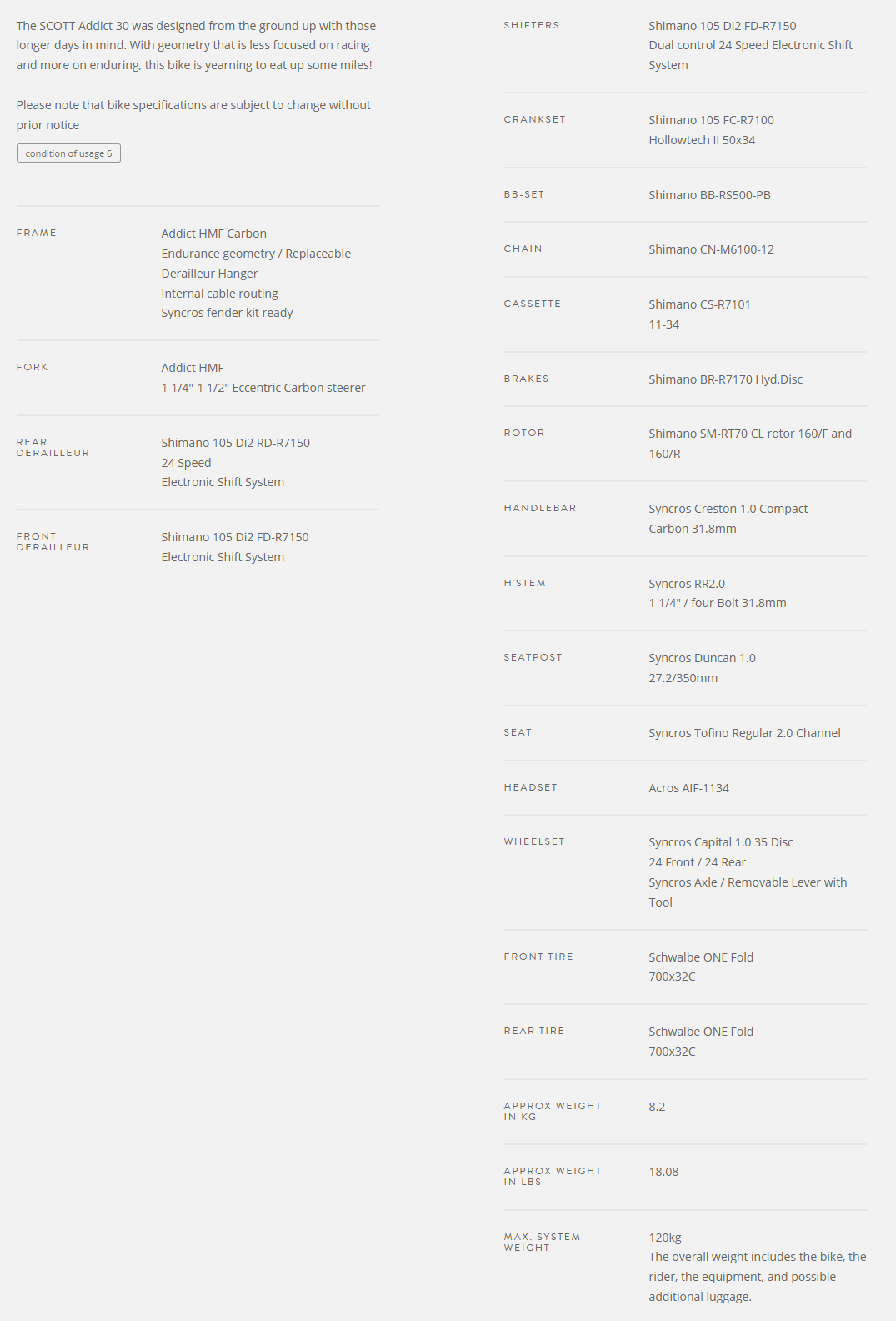 全新大改版,ADDICT家族的全新成員誕生,屬於Endurance耐力挑戰性格的ADDICT是完全重新設計的!採用HMF兼具高剛性與舒適性的碳纖紗,與ADDICT RC相似的車架後三角設計,下沉的後上叉不僅讓空氣力學效益更好,更能增加過彎時的穩定性,搭載Syncros專為全新ADDICT打造的內走線龍頭與把手,讓外觀變得更簡潔,可以感受到不同於競賽型車款的使用感受,同時在重量上亦毫不妥協的以輕量化為原則,並且加寬了前叉與後叉間距可容許最大32C的輪胎安裝,在舒適與強悍的調性之間取得平衡,搭載全新Shimano 105 Di2 12 speed電子變速系統,是您日常與運動使用的完美夥伴。