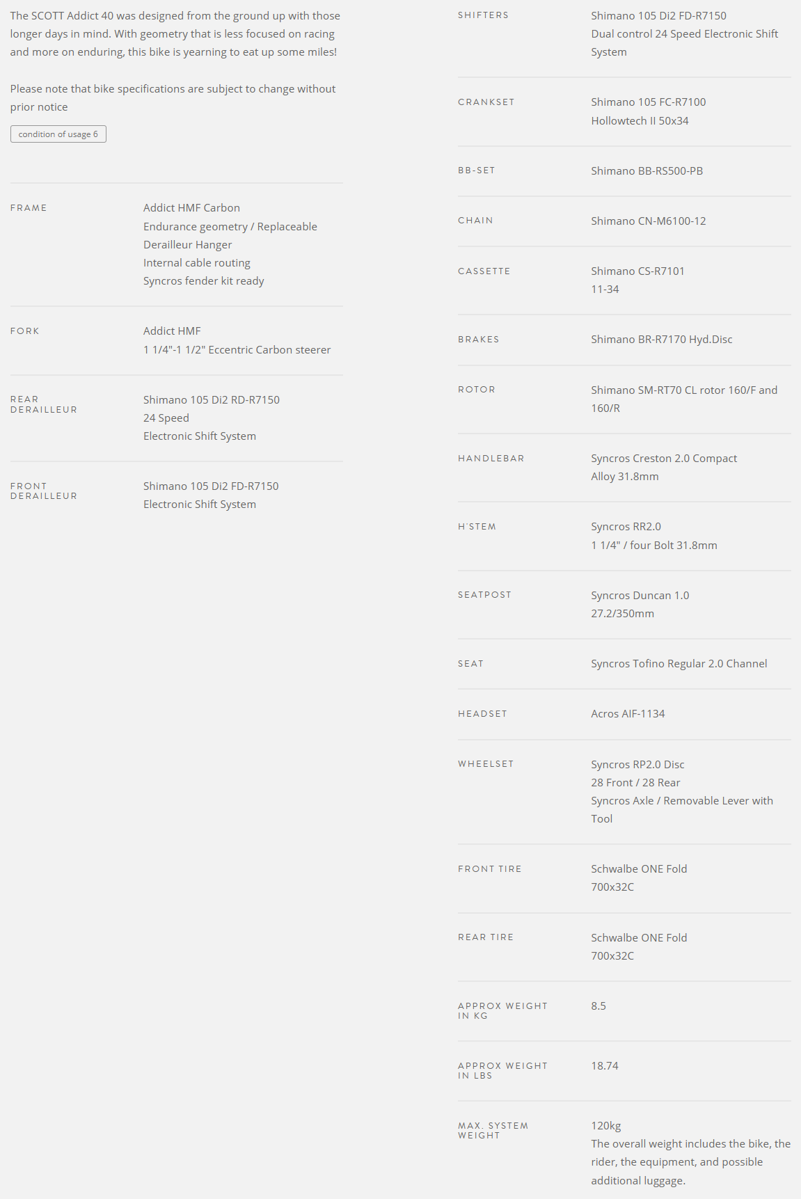 全新大改版,ADDICT家族的全新成員誕生,屬於Endurance耐力挑戰性格的ADDICT是完全重新設計的!採用HMF兼具高剛性與舒適性的碳纖紗,與ADDICT RC相似的車架後三角設計,下沉的後上叉不僅讓空氣力學效益更好,更能增加過彎時的穩定性,搭載Syncros專為全新ADDICT打造的內走線龍頭與把手,讓外觀變得更簡潔,可以感受到不同於競賽型車款的使用感受,同時在重量上亦毫不妥協的以輕量化為原則,並且加寬了前叉與後叉間距可容許最大32C的輪胎安裝,在舒適與強悍的調性之間取得平衡,搭載全新Shimano 105 Di2 12 speed電子變速系統,是您日常與運動使用的完美夥伴。