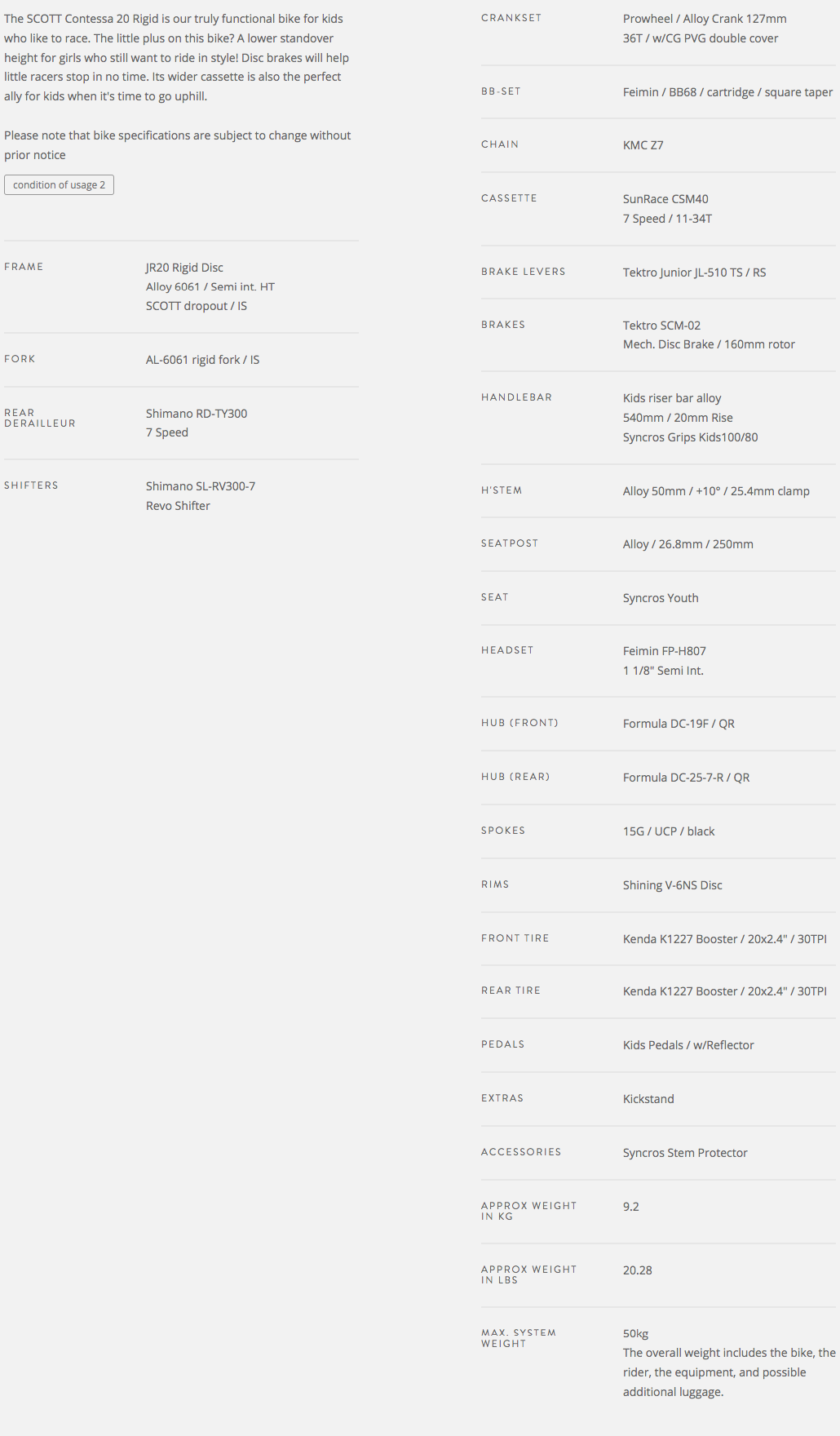 SCOTT Contessa 20 Rigid 是我們為喜歡比賽的孩子打造的真正功能性自行車。為還想時尚騎乘的女孩提供了更低的跨點!碟式煞車將幫助小騎士快速停下車輛。