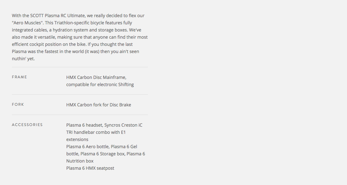 萬眾期盼,PLAMSA終於正式推出第六代!全新大改款的PLASMA 6是以碟煞作為基準設計與全內藏走線的俐落簡潔外觀!碳纖專家SCOTT以最嚴苛的風洞實驗以及鐵人世界冠軍Sebastian Kienle長期測試數據,輔佐最先進的複材科技,打造出全新PLASMA 6第六代三鐵計時怪獸,這不僅是一部車架,更包含了整體設計的豐富補給儲物設計,包含了一個全隱藏式的飲水用水壺與一個能量飲專用水壺,前方搭載一個超大的空力補給品置物盒,並與全球知名人體工學實驗室gebioMized共同創造出強大的調整性能,包括休息把角度與手臂托架位置都完全可以隨著個人設定調整,SCOTT又再一次創造了三鐵車科技的全新境界!